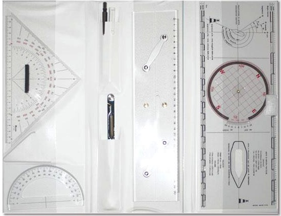 Completo per carteggio composto da 1 squadretta - compasso ottone cromato - parallela ad aste spostabili - tracciatore di rotta - goniometro a 180° - matita con mine e gomma.