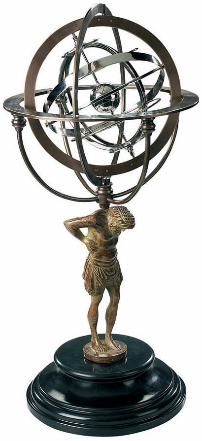 Un misto intrigante di scienza antica e mitologia greca: Atlante, uno dei titani mitologici, combatté contro le divinità dell’Olimpo ma fu sconfitto; per punizione, Zeus lo condannò a reggere per sempre sulle sue spalle virili il peso della Terra e della volta celeste. Nella nostra rappresentazione, tuttavia, Atlante sorregge l’intero Universo, per lo meno l’Universo com’era conosciuto nel Rinascimento, cioè con la Terra al centro. Un insieme di anelli concentri d’argento intersecati fra loro descrive la posizione e le traiettorie dei corpi celesti intorno alla Terra. Un oggetto etereo sotto ogni aspetto: è l’accostamento di scienza e bellezza estetica, di mito e realtà storica.