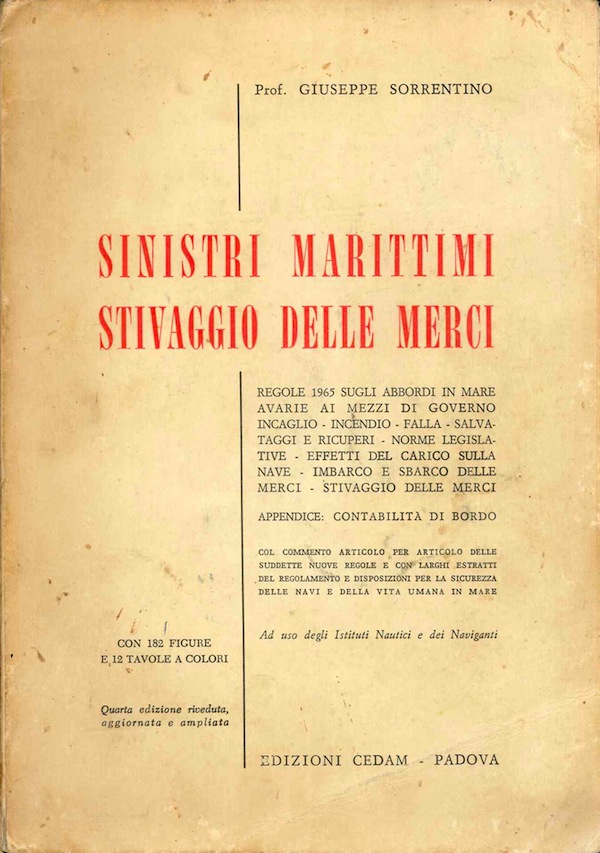 Regole 1965 sugli abbordi in mare, avarie ai mezzi di governo, incaglio, incendio, falla, salvataggi e recuperi, norme legislative, effetti del carico sulla nave, imbarco e sbarco delle merci, stivaggio delle merci Appendice: contabilità di bordo con commento articolo per articolo delle suddette nuove regole e con larghi estratti del regolamento e disposizioni per la sicurezza delle navi e della vita umana in mare. Ad uso degli Istituti Nautici e dei Naviganti.