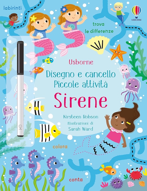 Labirinti, collega i puntini, scopri le differenze e tanti altri giochini ispirati al mondo delle sirene per esercitarsi a impugnare correttamente la penna in allegria. Grazie alle pagine plastificate è possibile svolgere le attività più e più volte.