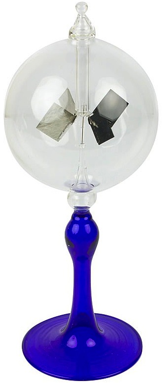 These curious and mesmerising instruments measure the power of electromagnetic radiation. Made from a glass bulb with much of the air removed to form a partial vacuum, inside is a set of fine metal vanes, each with one dark and one light side, mounted on a spindle. The vanes rotate, as if by magic, when exposed to sunlight, artificial light, or infrared radiation (even the heat of a hand nearby can be enough) – the more intense the light, the faster the rotation. - Il mulino a luce - anche conosciuto come radiometro - è un oggetto che riguarda il mondo delle dimostrazioni nella fisica, inventato nel 1872 dal fisico inglese Crookes. Questa piccola meraviglia tecnica e fisica mostra come la luce del sole riesca a produrre energia. Quando questo oggetto incontra una luce, che sia quella del sole o di una lampada (anche una piccola lampada calda a neon), inizia a produrre energia facendo roteare l'ago sospeso, tanto più forte quanto lo è la fonte luminosa.