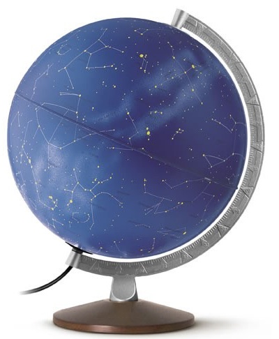 Sfera celeste luminosa. Rappresenta la volta celeste e le stelle. Doppio effetto con segni zodiacali. Base in legno color noce, arco effetto cromato.