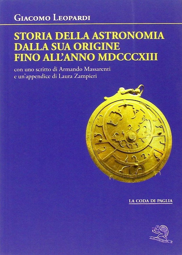 La più sublime, la più nobile tra le Fisiche scienze ella è senza dubbio l'Astronomia. L'uomo s'innalza per mezzo di essa come al di sopra di se medesimo, e giunge a conoscere la causa dei fenomeni più straordinari. Una così utile scienza dopo essere stata per molto tempo soggetta alle tenebre dell'errore ed alle follie degli antichi filosofi, venne finalmente ne' posteriori secoli illustrata a segno, che meritatamente può dirsi, poche esser quelle scienze, che ad un tal grado di perfezione siano ancor giunte. L'uomo può certamente vantarsi di aver superati i maggiori ostacoli, che la natura oppor potesse al prepotente suo ingegno, e d'esser quasi giunto all'apice della sapienza. Gli uomini han fatto mai sempre grande stima della scienza degli astri. Esordisce così Giacomo Leopardi in questa opera giovanile dalla quale riceverà riconoscimenti che salgono ben presto a un grado di ammirazione e che esaltano la eccezionale importanza del filologo.