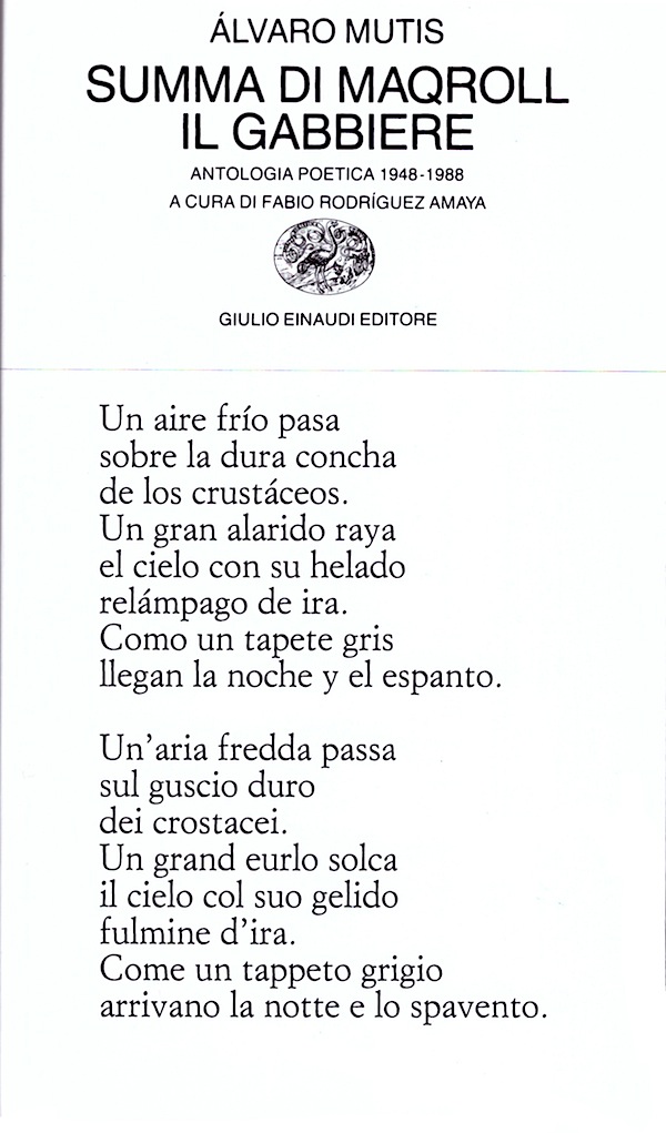 Non è difficile riconoscere in Alvaro Mutis la voce di un vero poeta. E, aggiungo, un poeta della stirpe piu rara in spagnolo: ricco senza ostentazione e senza spreco. Necessità di dire tutto e coscienza che nulla si dice. Amore per la parola, disperazione dinanzi alla parola, odio verso la parola: estremi del poeta. Gusto per il lusso e gusto per l'essenziale, passioni contraddittorie, ma che non si escludono l 'un l'altra e alle quali ogni poeta deve le sue migliori poesie [...]. Lo spirito esita tra la pietra e la putrefazione. E il miglior momento della grande nudità e, anche, dell'apogeo della forma. Lusso e agonia: cerimonia della catastrofe, rito del disastro. Tutto, inclusa la morte, esige una liturgia. Non esiste mito, non c'è favola ricreatrice del mondo e, in una parola, non esiste poesia senza un rito.