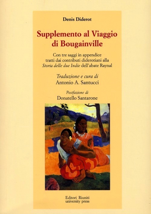 Nell'aprile 1768 aveva soggiornato a Tahiti un barone francese, Louis-Antoine de Bougainville, capitano di vascello della Marina regia e protagonista del primo periplo del mondo compiuto da un francese. Su questo soggiorno nell'isola polinesiana il colto e spregiudicato capitano, allievo del matematico e filosofo illuminista d'Alembert, scrisse le pagine più suggestive di quel "Viaggio intorno al mondo" apparso nel 1771 a Parigi e ricco di importanti conoscenze di carattere cartografico su quelle terre lontane e misteriose. Al fascino di quelle pagine non si sottrasse Denis Diderot (1713-1784), il quale, nonostante fino ad allora si fosse dimostrato critico sulle meraviglie dello stato di natura, dedicò una recensione al Viaggio del capitano francese, per poi, nel 1772, terminare il "Supplemento al Viaggio di Bougainville", oggi riproposto nella cura e nella traduzione di Antonio A. Santucci, studioso gramsciano prematuramente scomparso nel 2004. Il libro - di notevole interesse per lo studio dell'immagine europea del mondo non occidentale - è costruito sotto forma di dialogo e presenta alcune delle problematiche più care a Diderot. "L'importanza storica dei viaggi in periodo illuministico, l'interesse scientifico per le nuove scoperte geografiche, il problema già affacciatosi con Montaigne di una molteplicità di culture non scandite nel tempo, ma coesistenti nello spazio... Postfazione di Donatello Santarone.