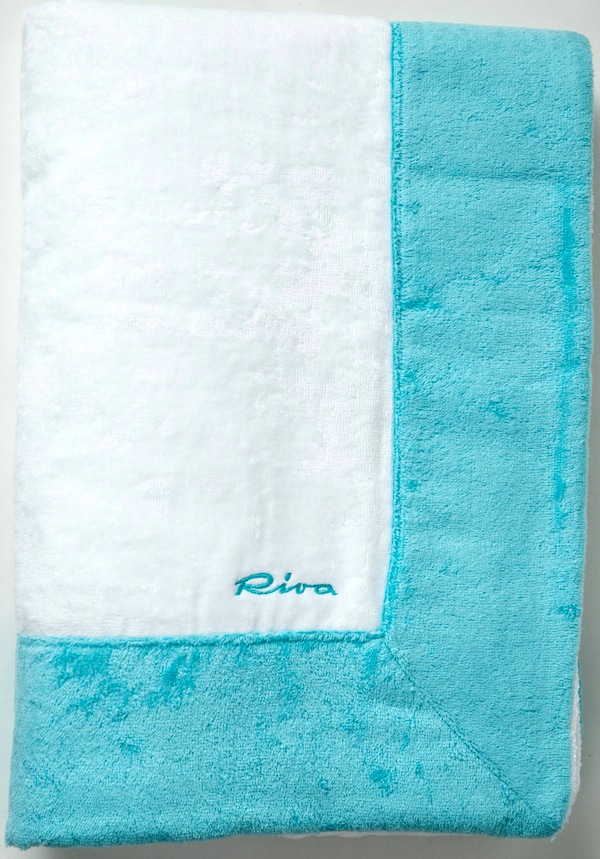 In barca, in spiaggia o in piscina, porta con te il telo mare Riva, con il marchio che spicca nel colore acquamarina e blu. Lo stile solare e raffinato del cantiere nautico più famoso al mondo è perfettamente racchiuso in questo accessorio distintivo, realizzato in morbida spugna di cotone. Ovunque tu sia, questo telo mare certifica la tua appartenenza al club esclusivo dei fan di Riva. Misure: 180x100.