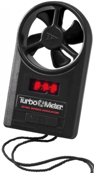 The Turbo Meter provides uncommon accuracy, sensitivity, and pocket-sized convenience. It is based on the principle that a freely turning turbine will rotate at a speed directly proportional to the wind speed. To insure maximum sensitivity and accuracy, the turbine is suspended on sapphire jewel bearings, and its rotation is sensed by an infrared light beam which adds no friction. The resulting signal is processed electronically by an LSI (Large Scale Integrated) circuit for improved reliability and reduced size. A special three digit display is used for extra resolution and provides excellent viewing contrast in bright sunlight. A handy switch selects between four different scales —knots, feet per minute, meters per second, and miles per hour — for unmatched versatility. Unit is compact size (2.6 x 4.7", 7x 12cm) and light weight ( 3oz., 85g). Measures wind speed from 0 - 99.9 mph.