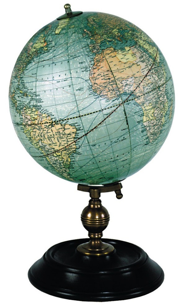 A contemporary classic. 1920s Weber Costello globe is displayed on ebonized wood stand accented bronze. Colored gores are applied to the globe core by hand with authentic construction and detail.The world in 1921. Roaring, yes…and still colonial.